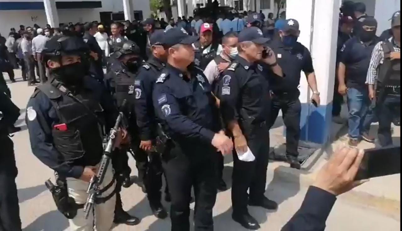 Encabezando a un nutrido grupo de la Policía Estatal, Bermúdez Requena se presentó de manera prepotente a «dialogar» con sus «compañeros», quienes desde este lunes se encuentran en protesta y exigen la destitución de Antonio Zacarías, director de la corporación.