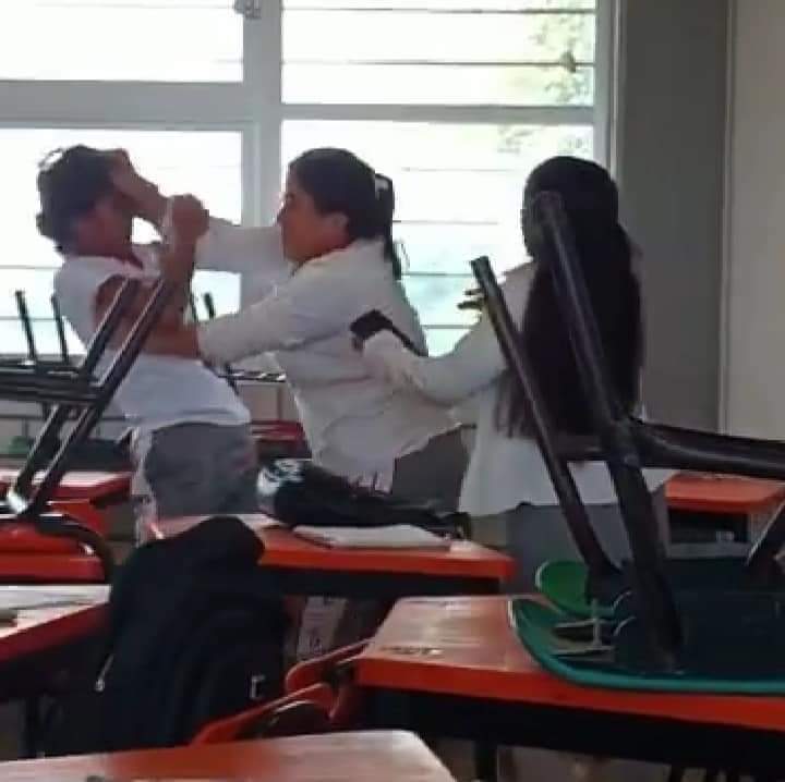 Entre los videos subidos a la red, por los propios educandos, estuvo el de una joven identificada como “Dorca”, quien abofeteó a una de sus compañeras para iniciar una trifulca dentro del salón de clases, la cual, en ausencia de maestros, tuvo que ser detenida por otros jóvenes.