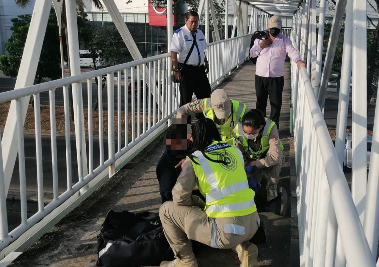 Con algunos respondes en manos y rodillas resultó una persona del sexo femenino, de aproximadamente 65 años de edad, al caerse cuando caminaba por el puente peatonal que atraviesa la avenida Adolfo Ruiz Cortines, a la altura de Plaza Olmeca.