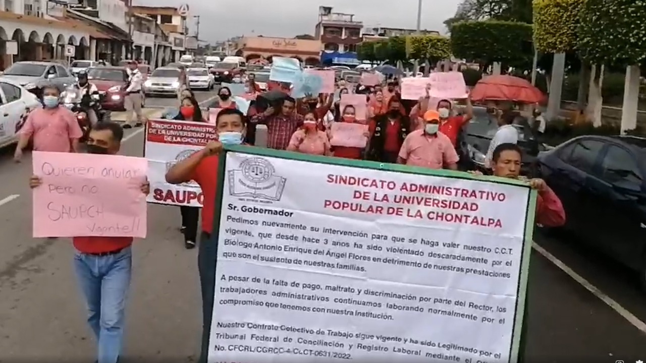 Trabajadores de la Universidad Popular de la Chontalpa, aquella que fue fundada por Andrés Manuel López Obrador en los años noventa, marcharon por las calles de Cárdenas para exigir respeto al Contrato Colectivo de Trabajo, el cual ha sido violentado por su rector Antonio del Ángel Flores.