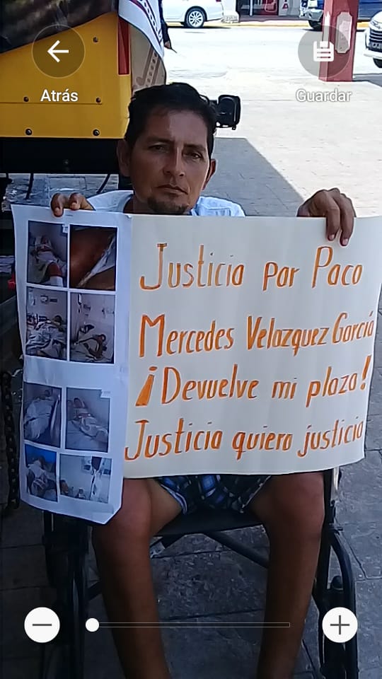 Uno de los agraviados, José Francisco Peregrino Méndez, pese a encontrarse en silla de ruedas, se posicionó desde temprana hora en la casilla que se instaló en la periferia de la Casa de la Cultura, donde pancarta en mano demandó públicamente a la actual secretaria Mercedes Velázquez, le devuelva la plaza que le robó aprovechando que se encontraba hospitalizado por un infarto.