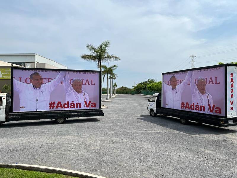 Montados en coches que los trasladaban por la ciudad, se distinguieron carteles de gran tamaño, en ellos figuraba el actual secretario de Gobernación y exgobernador de Tabasco, junto al presidente Andrés Manuel López Obrador con la leyenda #Adanva. Estos carteles fueron, supuestamente, hechos por un grupo llamado Amigos Adán López NL.