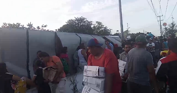 Un tráiler accidentado en la carretera a Frontera dejó expuesto su cargamento de alcohol y, ni tardos ni perezosos, vecinos aprovecharon para surtir sus cavas.