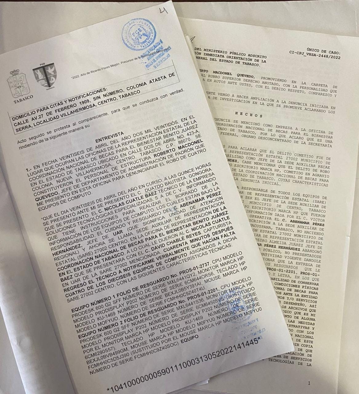 De acuerdo a una copia de la carpeta de la denuncia legal, fue el jefe del departamento de Administración, Roberto Magdonel, quien presentó la denuncia penal, luego de que personal de mantenimiento reportara la desaparición de los equipos asignados a la SARE 02.