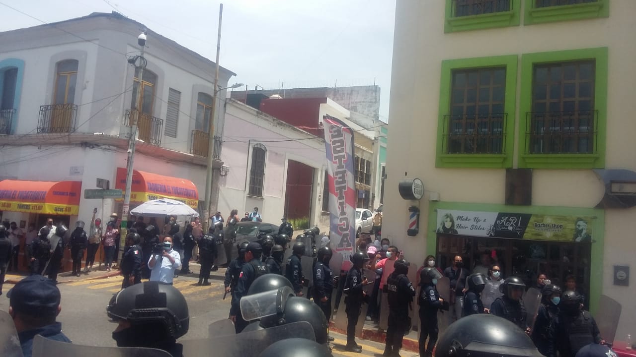 Los maestros que reclamaban el pago de su retroactivo por el incremento salarial de este año bloquearon la esquina de la avenida 27 de febrero y la calle Independencia en el centro de Villahermosa, y, como respuesta, fueron desalojados por policías antimotines de la Secretaría de Seguridad y Protección Ciudadana (SSPC) del gobierno estatal.