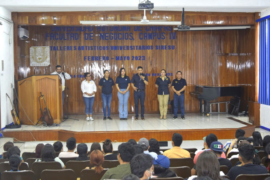 Con la participación de la comunidad estudiantil del Campus IV de la Universi­dad Autónoma de Chiapas, se llevó a cabo la inaugura­ción de los Talleres Artísticos Universitarios del actual se­mestre, organizado por la Se­cretaría de Identidad y Res­ponsabilidad Social Univer­sitaria (SIRESU) Extensión Istmo-Costa y Soconusco a través del Departamento de Cultura.
