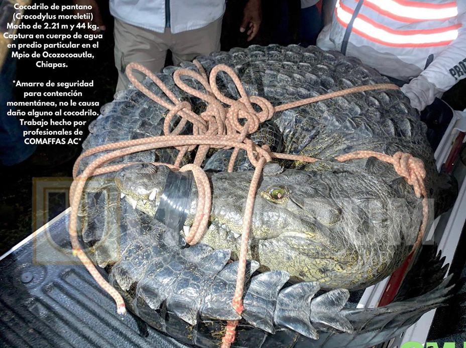 Señalaron que el manejo fue cuidadoso, a fin de no lastimar al saurio, por lo que se le aplicó un amarre de seguridad (de dona) que es para contención momentánea, situación que no le causa daño alguno al animal. Especialistas de COMAFFAS dieron a conocer que se trata de un Cocodrilo de Pantano (Crocodylus Moreletii), una especie que no pertenece a esta región de Chiapas pues su hábitat natural se encuentra más hacia la parte norte de la entidad, por lo que se presume que se trata de un ejemplar que estaba en cautiverio y que se escapó del mismo. Informaron que el animal fue hallado en buenas condiciones, con una medida de 2.21 metros de largo y teniendo un peso de 44 kilogramos, el cual terminará siendo transportado por los especialistas de COMAFFAS, instancia que se pondrá en coordinación con las autoridades ambientales, a fin de saber el destino final que tendrá este reptil.
