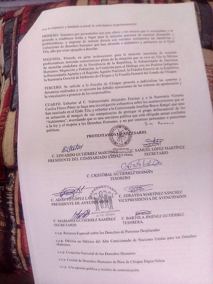 Integrantes del Comisariado Ejidal del municipio de Tila, solicitaron por enésima ocasión, se gire instrucción para la atención inmediata de la problemática que persiste en aquel municipio, del cual ya tiene conocimiento autoridades estatales y federales, así como organismo de derechos humanos, ya que además persiste una situación tensa y de riesgo por nuevas agresiones por parte de los llama dos integrantes de un grupo autónomo. _“Queremos manifestarles que ha sido de nuestro conocimiento que la Comisionada para el Diálogo en los pueblos Indígenas de la Secretaría de Gobernación se está reuniendo con el grupo de los Autónomos, para realizar las elecciones de autoridades ejidales en el Ejido tila, al margen de los ejidatarios y autoridades ejidales que hemos sido respetuosos de la legalidad y solicitado intervención del gobierno para que se aplique la ley”, asegura en un escrito firmado entre otros, por el presidente del comisariado Ejidal, Eduardo Gutiérrez Martínez.