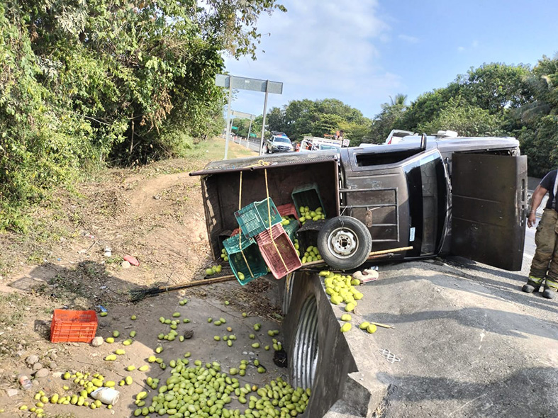 Elementos del cuerpo de bomberos y de Servicios Auxiliares de Emergencia atendieron a Benito “N”, de 36 años de edad, quien es cortador de mango. mEl herido explicó que venía a bordo de un vehículo en la parte de atrás, mismo que transportaba cajas de mango. El caso es que se le estalló la llanta trasera y el conductor perdió el control del vehículo y terminó volcado varios metros adelante, cerca de una alcantarilla.