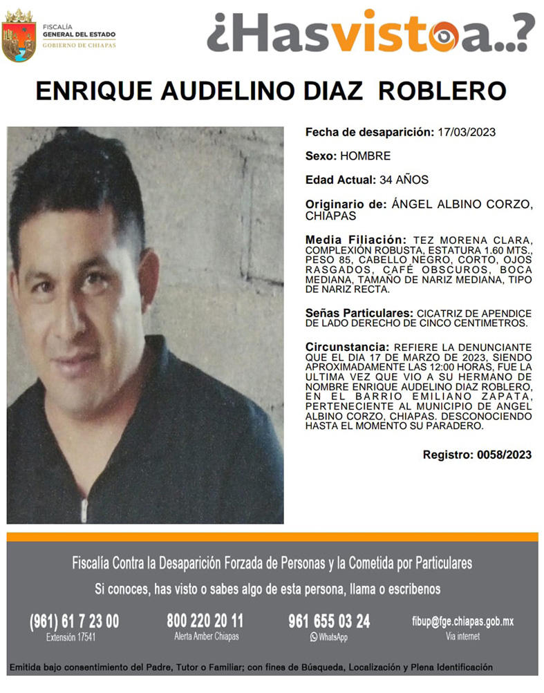 Presumiblemente, quienes fueron privados ilegalmente de su libertad responden a los nombres de Enrique Audelia Díaz Roblero, a quien sacaron del interior de una tortillería; y el otro fue Willy Estoqueli González, alias El Duende, hijo de Hiber González, cono­cido con el mote de El “Guacho”, a quien violentamente plagiaron el interior de su domicilio. Sé denuncia que en los últimos días se han observado diferentes levantones y cateos en diferentes domicilios de per­sonas conocidas en la localidad.
