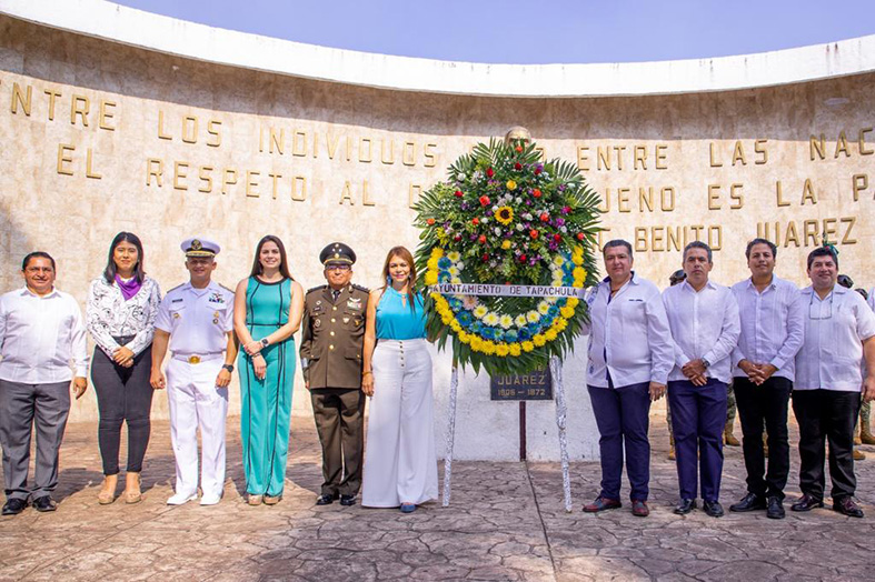 La alcaldesa tapachulteca destacó que la Cuarta Transformación de la vida pública de México sigue teniendo en Juárez al mejor referente por su ejemplo de defensa de la legalidad, austeridad y honestidad como servidor público. “En la administración federal del presidente Andrés Manuel López Obrador y en Chiapas del gobernador Rutilio Escandón Cadenas, los valores juaristas están presentes al colocar como Bandera la Ley y como norte la Felicidad del pueblo”. Posteriormente, autoridades municipales depositaron una ofrenda floral al pie de la estatua ubicada en el parque Juárez.