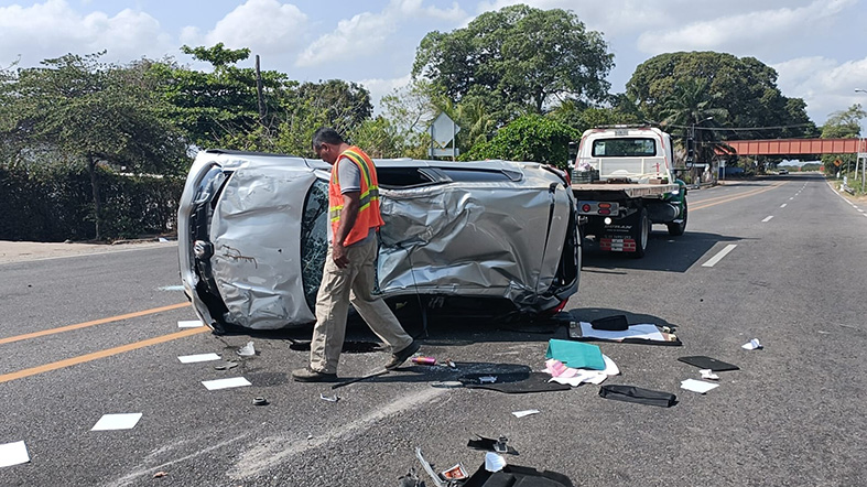 Una persona con crisis nerviosa dejó como saldo la volcadura de un vehículo Kia, con placas del estado de Chiapas, sobre la carretera Tapachula-Puerto Madero, a la altura de la parada de Los Toros.