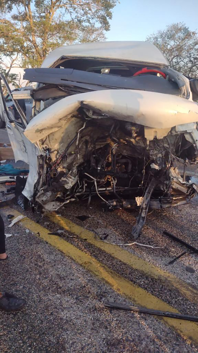 La colisión se dio entre una unidad tipo Urvan del servicio público de pasaje de la línea Jaguares, un vehículo compacto color azul y una camioneta que transportaba agroquímicos, los cuales colisionaron de frente cuando el coche intentó rebasar.