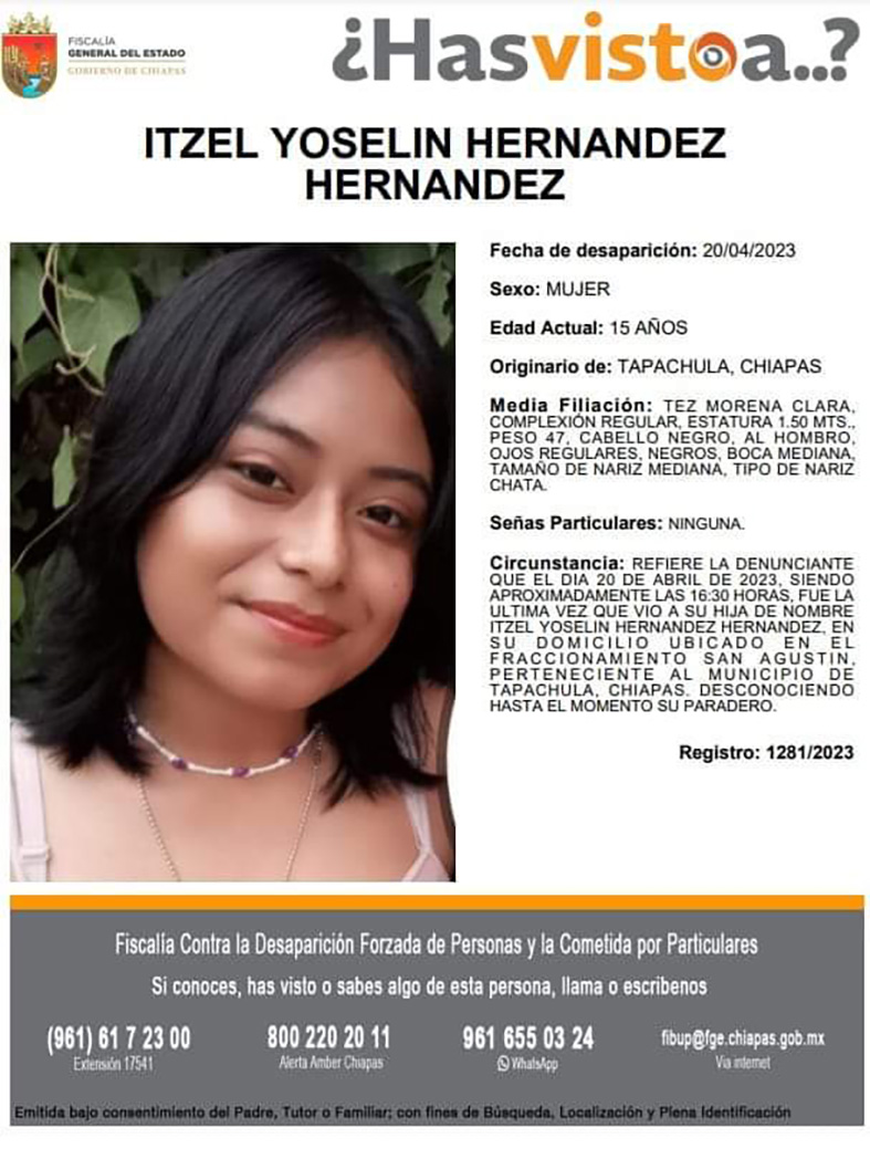 Una menor reportada como desaparecida en ¿Has visto a? Fue encontrada por sus padres en el centro de esta ciudad. Los padres de la menor Itzel Yoselin “N” dijeron que la habían ubicado en la 7a calle Poniente, entre la 10ª y 12ª Norte de la colonia Centro de Tapachula con una señora.