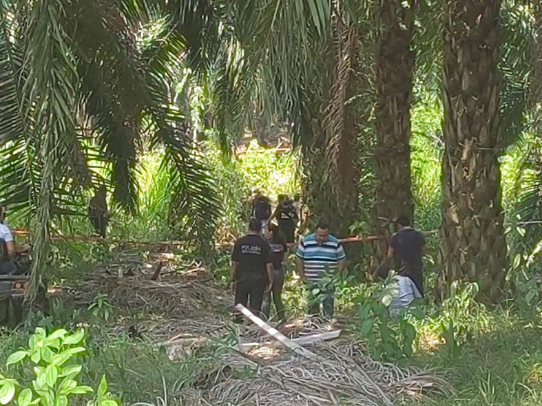 Elementos de Seguridad Pública y de investigación, así como agentes periciales de la Fiscalía de Distrito Zona Selva, hicieron acto de presencia en un predio particular a orillas del tramo Palenque-Catazajá, después de que a través de una llamada anónima se reportara que algo sospechoso estaba enterrado. Al llegar personal de periciales, apoyados por policías municipales, procedieron a realizar una excavación en un lugar señalado bajo la sombra de un plantío de palma de aceite.