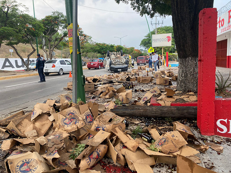 La tarde del pasado sábado sobre el libramiento sur y 18 poniente frente a la clínica de la Luz, una camioneta Nissan blanca la cual transportaba cervezas termina volcando. El origen del accidente fue por el exceso de velocidad y falta de pericia para maniobrar sobre la vía, afortunadamente los dos ocupantes salieron ilesos del accidente. Agentes de tránsito municipal llegaron al lugar el cual fue cerrada la vía en el carril de oriente a poniente, así mismo pidieron el apoyo de bomberos para poder hacer la limpieza del lugar ya que del fuerte impacto las cajas de cervezas salieron proyectadas dejando vidrios esparcidos sobre la vida. Una grúa con plataforma llegó al lugar para poder mover la unidad para que sea llevada aún corralón en turno.