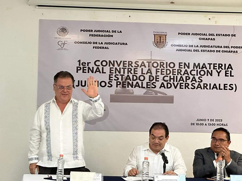 El magistrado presidente del Poder Judicial del Estado de Chiapas, Guillermo Ramos Pérez, encabezó junto al coordinador de Magistrados de Tribunales Colegiados de Circuito en Tuxtla Gutiérrez, Pedro Guerrero Trejo y el magistrado del Tribunal Colegiado en Material del Trabajo del Vigésimo Circuito, Luis Arturo Palacios Zurita, la inauguración del Conversatorio Primer Encuentro entre Juzgadores de Primera y Segunda Instancia Estatal y Federal 2023. Reflexiones en Materia en Justicia Penal, que se realizó en la Escuela de la Judicatura Federal.
