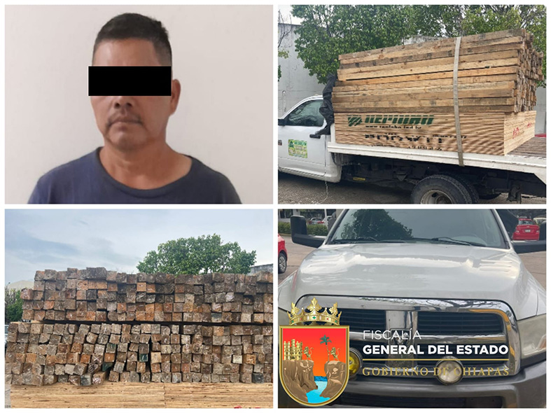 Elementos de la Policía de Investigación a la altura del libramiento sur poniente en el municipio de Tuxtla Gutiérrez detuvieron a Marcelo “N”, quien transportaba 300 polines de madera de pino a bordo de un vehículo marca Chrysler tipo Ram de color blanco con placas del estado de Chiapas.