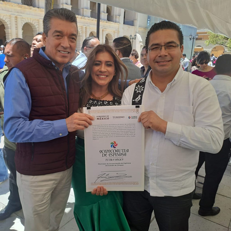 Desde la bella Ciudad de San Cristóbal, teniendo como marco el Museo de Arte Contemporáneo, recibí el nombramiento oficial de PuebloMágico para Ocozocoautla, de manos del Sr. Gobernador del Estado, Rutilio Escandón Cadenas, quien estuvo acompañado por el Secretario de Turismo Federal, el Lic. Miguel Torruco Marqués y la Secretaria de Turismo del estado, la Lic. Katyna de la Vega Grajales.