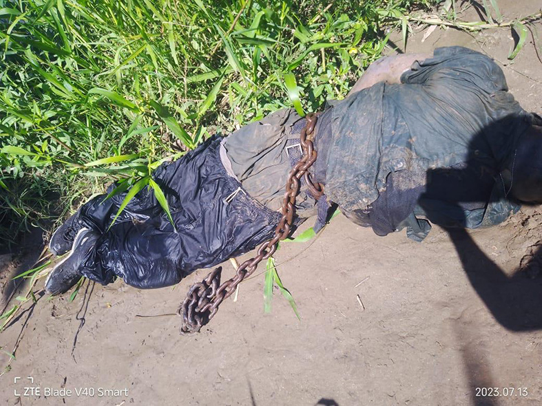 Alrededor del cadáver se observaba una pesada cadena que presumiblemente le fue amarrada para que quedara sumergido en el río Suchiate.