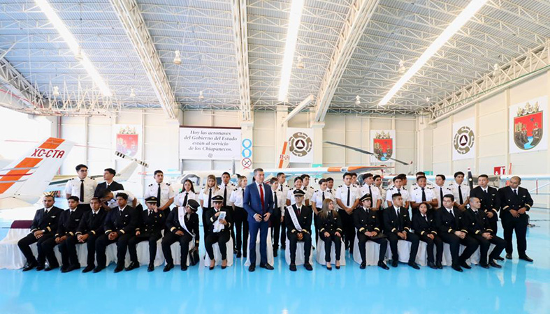 Por su parte, el secretario de Protección Civil, Luis Manuel García Moreno, destacó que este acto marca un hito en la historia de la aviación en Chiapas, toda vez que, gracias a la iniciativa del gobernador y al apoyo del presidente Andrés Manuel López Obrador, mediante las Becas Benito Juárez se logró consolidar esta primera generación y se refuerza la proyección de recursos humanos altamente calificados, disponibles para operar, administrar y mantener el sistema de transporte aéreo regional, nacional e internacional.