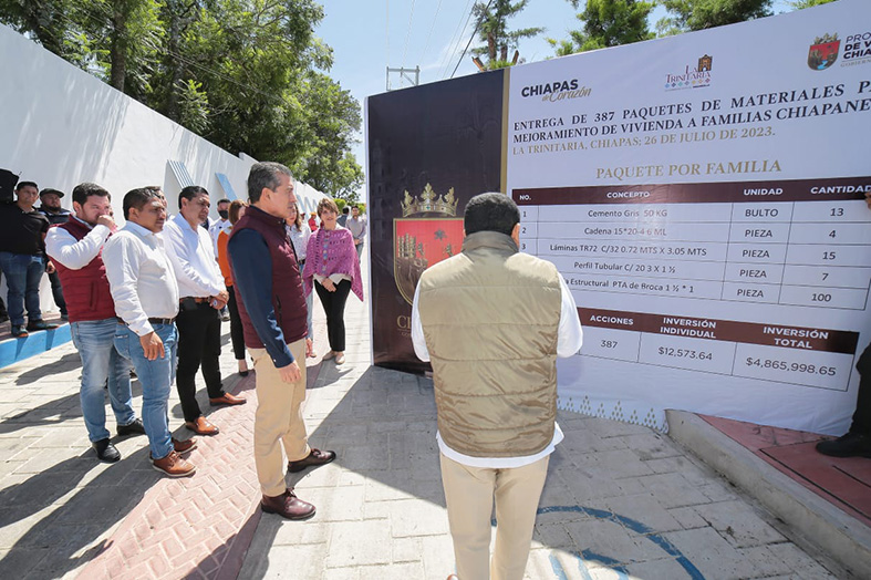De igual forma, celebró la suma de esfuerzos al entregar los paquetes de materiales para mejorar las viviendas de este municipio, pues, aunque hoy el Gobierno del Estado está otorgando 387, con la mezcla de recursos del Ayuntamiento se llegará a mil apoyos de este tipo en La Trinitaria.