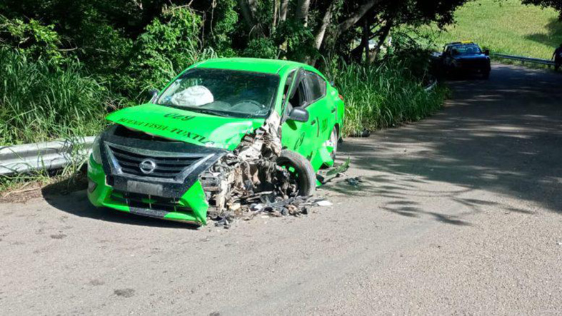 Un taxi acabó con múltiples daños en la parte frontal luego de estrellarse de frente contra una camioneta, cuando salía de una de las curvas en la ruta que va de esta ciudad hacia el poblado de Revolución Mexicana.
