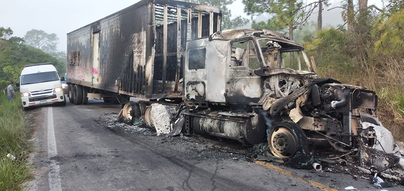 Integrantes del Frente Nacional de Lucha por el Socialismo (FNLS) de la comunidad Río Florido, del municipio de Ocosingo, retuvieron un camión Tortón de color Blanco, para finalmente prenderle fuego alrededor de las 4 de la mañana, al igual que una camioneta del mismo color, cuyos conductores se desconoce dónde se encuentren.