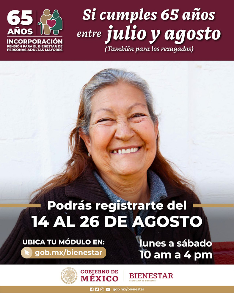 La secretaria de Bienestar, Ariadna Montiel Reyes, informó que del 14 al 26 de agosto se realizará en todo el país el registro de incorporación a la Pensión para el Bienestar de las Personas Adultas Mayores para quienes cumplen 65 años entre los meses de julio y agosto.