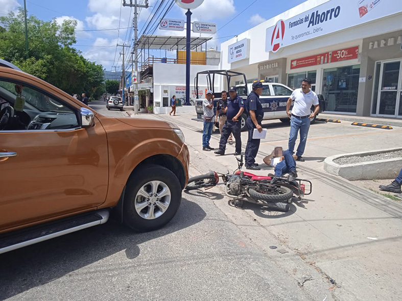 La falta de precaución provocó que el conductor de una camioneta marca Nissan tipo Frontier color cobre con láminas locales impactará a Jesús Alejandro que maniobraba una motocicleta marca Italika color roja al momento del percance, quedando sobre la carpeta rodante tras el impacto.