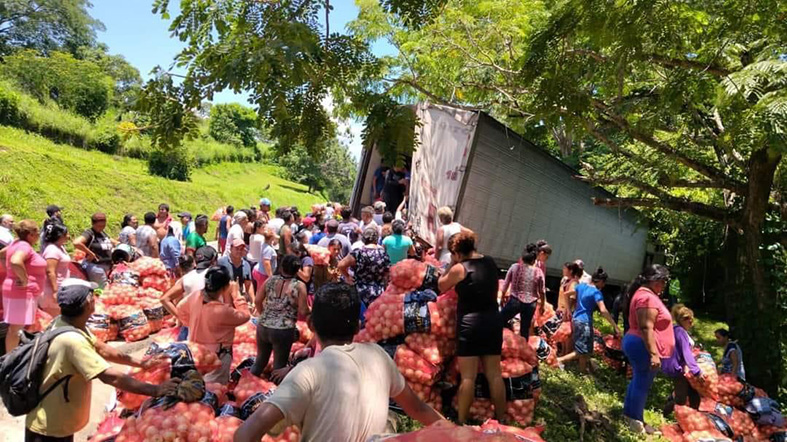 Una unidad tipo tráiler que transporta­ba varias toneladas de cebolla perdió el control cuando transitaba en la ruta que conecta a esta localidad con Pijijiapan, a la altura del kilómetro 91, en un hecho que dejó cuantiosos daños materiales y en la que la población aprovechó para hacer rapiña.