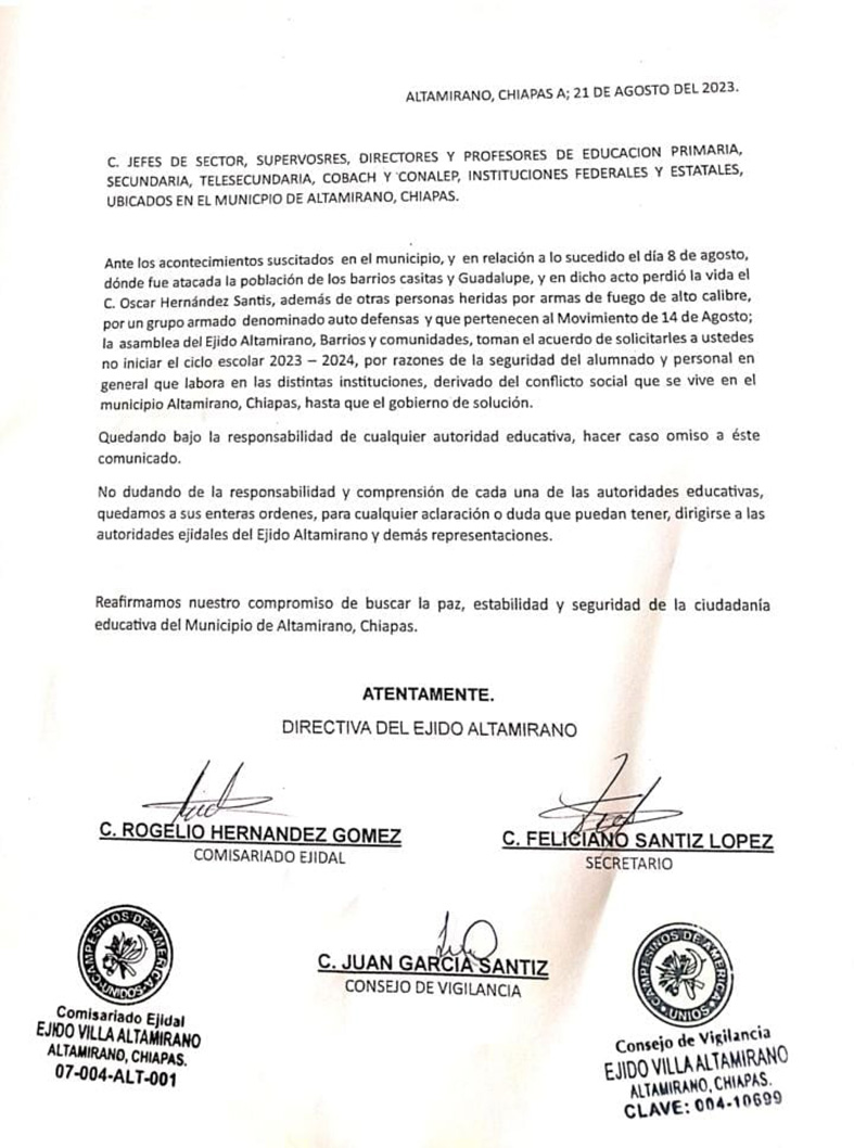 A través de un comunicado, la directiva del ejido Altamirano informa a docentes de nivel primaria, secundaria, telesecundaria, Conalep y COBACH la suspensión del ciclo escolar.
