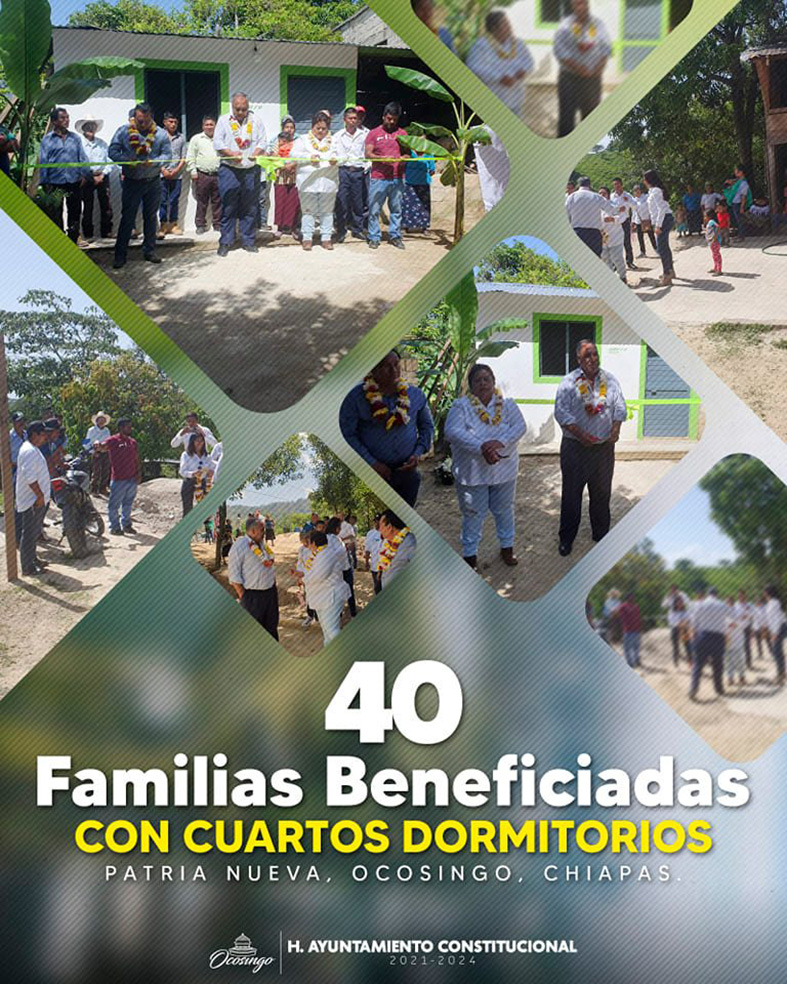 En el barrio San Juanito de la localidad Patria Nueva, Ocosingo, Chiapas, fueron beneficiados 40 familias a través del proyecto de cuartos dormitorios, obras priorizadas por la actual administración que dirige el presidente constitucional Gilberto Rodríguez de los Santos.