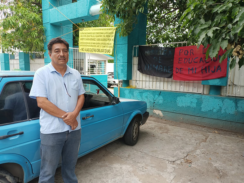 Relató que, la mejor sacó su ficha presentó su examen lo pasó, “pero resulta que el señor director no ha aceptado inscribir a mi hija porque me está obligando a pagar la cuota que se supone es voluntaria. Tiene más de un mes que estoy en pláticas con él, de hecho, por escrito y de manera verbal sabe que no tengo dinero soy trabajador de esta escuela, pero tengo muchos gastos”.