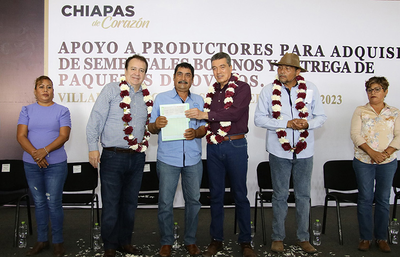 “Con el ejemplo del presi­dente Andrés Manuel López Obrador, en Chiapas seguimos haciendo justicia social y ga­rantizando una mejor calidad de vida a la gente, mediante el fortalecimiento de la gana­dería, una de las actividades productivas más importan­tes, porque no sólo garantiza la alimentación, sino que ge­nera empleos para la gente. Por ello, me siento contento de constatar los apoyos perma­nentes que recibe el pueblo de Villaflores, desde fertilizantes, semillas mejoradas, insumos para el campo, apoyos para la ganadería, aves de corral y de traspatio”, apuntó.