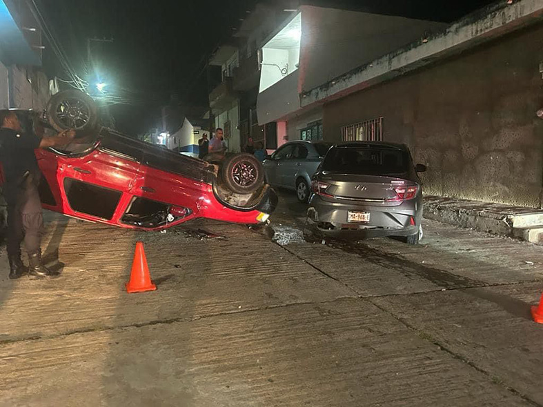 El percance ocurrió cerca de las 04:00 de la mañana de este domingo, en la calle de la 4ª sur y 5ª poniente de esta ciudad, en el cual se sabe que la mujer de nombre Elva “N”, maniobraba una camioneta tipo Escape de la marca Ford, la cual acabó volcando tras impactarse contra un automóvil tipo aveo de la marca Chevrolet y un vehículo compacto de la marca Hyundai.