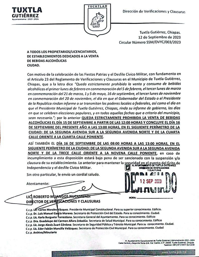 La Dirección de Verificaciones y Clausuras del ayuntamiento capitalino, detalló que quedó estrictamente prohibida la venta de bebidas alcohólicas en el perímetro conformado desde la 2a avenida sur a la 2a avenida norte y de la 4a calle oriente a la 4a calle poniente del centro tuxtleco.