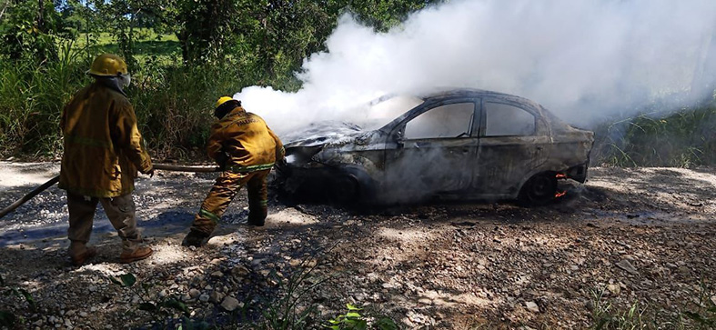 Una unidad del transporte público en su modalidad de taxi del sitio Maya Pakal con número económico 033 de Palenque, terminó calcinado en su totalidad en un camino de terracería a la altura de la entrada a la ranchería El Porvenir de Palenque.