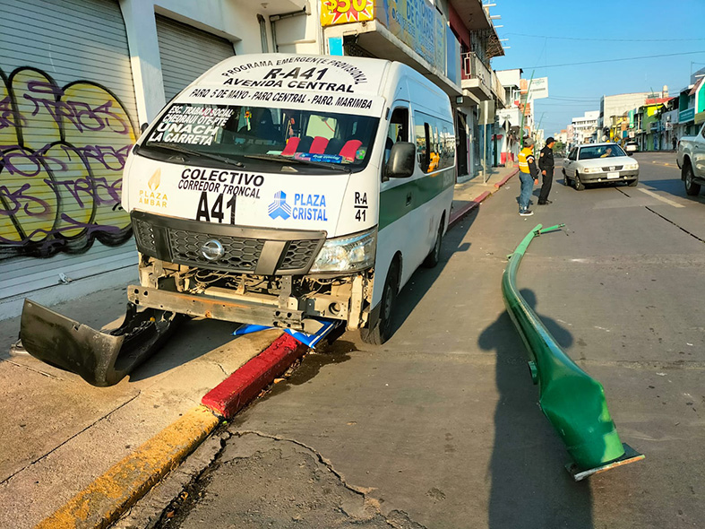 Elevados daños materiales fue lo que dejó como saldo el choque de un colectivo contra un poste del alumbrado público en la zona centro de la capital del estado, afortunadamente no hubo personas lesionadas. Lo anterior se registró cerca de las 09:00 horas del lunes sobre la Avenida Central entre la 10a y 11a calle Oriente de Tuxtla.El percance se originó debido a una presunta falla mecánica, lo que provocó que el conductor de un colectivo marca Nissan tipo Urvan de la ruta A-41 perdiera el control de la unidad, subiéndose a la acera, deteniéndose al estrellarse contra un poste del alumbrado público, dejando daños materiales. Afortunadamente no se registraron pasajeros lesionados, por lo que los oficiales de Tránsito y Vialidad arribaron al punto. Más tarde; los efectivos dieron la orden para que el colectivo fuera llevó a un corralón por una grúa de plata- forma para realizar las indagatorias correspondiente.