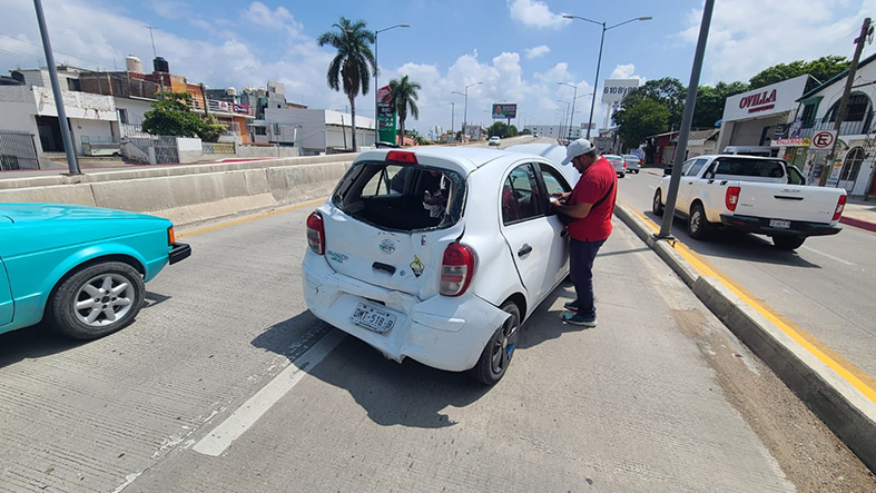 Una camioneta marca chevroleth tipo S10 de color blanca y un vehículo marca nissan tipo march de color blanco protagonizaron un aparatoso accidente automovilístico sobre el libramiento sur a la altura de la 13 y 14 poniente de esta capital. El parte oficial indicó que un vehículo marca Volkswagen tipo caribe de color celeste circulaba sobre el carril de poniente a oriente cuando una falla mecánica hizo que se detuviera. La unidad averiada quedó varada, por lo que puso sus intermitentes, el March qué viajaba tras de éste al ver la acción detuvo su marcha de forma abrupta, la pick up qué se presume viajaba en presunto exceso de velocidad no alcanzó a frenar y chocó contra el sedán blanco.