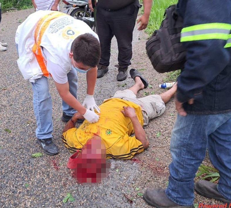 Presentaba traumatismo craneoencefálico, herida en la parte frontal izquierdo y laceraciones en brazos, así mismo se trasladó de emergencias al Hospital General de Palenque para su atención inmediata.