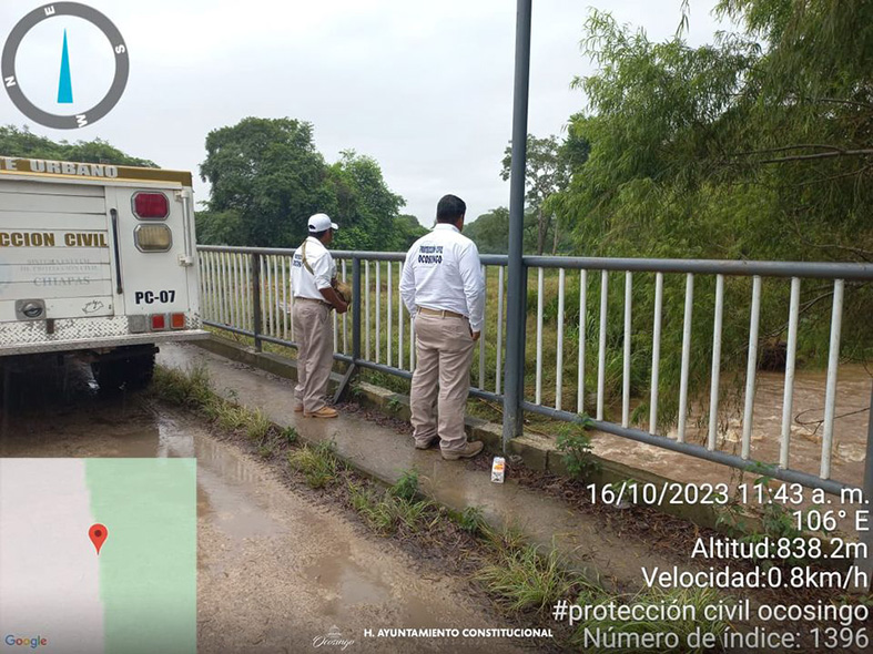 Protección Civil y Bomberos de Ocosingo acudieron a la verificación de los puentes, uno ubicado por el barrio Magisterial conocido como Puente Sha Sha, luego el puente La Virgen ubicado en el barrio del mismo nombre, el primero se encuentra con un crecimiento de un 20% de su nivel, mientras que el segundo en un 10%, ambos fluyen sin problemas. Así mismo por instrucciones del Presidente Municipal C. Gilberto Rodríguez de los Santos, Protección Civil Municipal estará monitoreando constantemente debido a las lluvias que aún continúan en nuestra región, esto con el objetivo de salvaguardar la integridad de la ciudadanía que vive cerca de estos lugares.