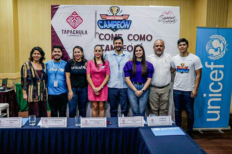 El Ayuntamiento de Tapachula y UNICEF presentaron la campaña “Come como Campeón”, con la que se pretende fomentar los hábitos alimenticios saludables y la práctica del deporte en niñas, niños y adolescentes. Con la presencia del secretario de Salud Municipal, Eduardo Medina Olivera, en representación del Ayuntamiento, la presidenta honoraria del Sistema DIF Tapachula, Irene Rubiera Urbina, Mauro Brero, jefe de Salud y Nutrición en UNICEF México, Delhi Trejo, Oficial de Nutrición en UNICEF México y Roberto Sumuano Campeón de Taekwondo, la campaña “Come como Campeón” se puso en marcha para promover mensajes y acciones que ayuden a cambiar la percepción de niñas, niños y adolescentes sobre su consumo alimenticio.