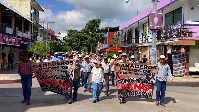 Con dos lonas que decían “Ganaderos Unidos de Juárez Chiapas, pedimos justicia ya no más extorsión” el grupo de más de 50 productores recorrieron las calles de la ciudad desde la glorieta de la cabeza maya, pasando por el edificio de la Fiscalía de Distrito Zona Selva, Presidencia Municipal y en las instalaciones de la Delegación de la Secretaría de Gobierno.