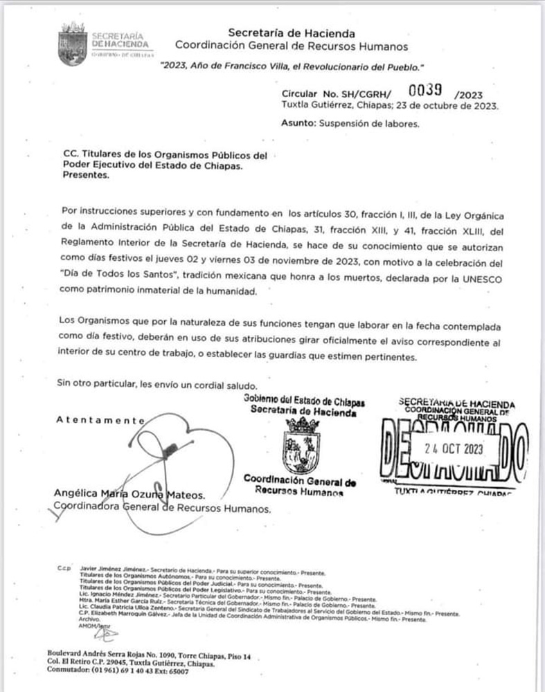 La mañana de ayer Angélica María Ozuna Mateos, Coordinadora General de Recursos Humanos de Gobierno de Chiapas informó por medio de la circular SH/CGRH/0039/2023 a los titulares de los Organismos Públicos del Poder Ejecutivo del Estado de Chiapas que no habrá labores los días 2 y 3 de noviembre próximos.