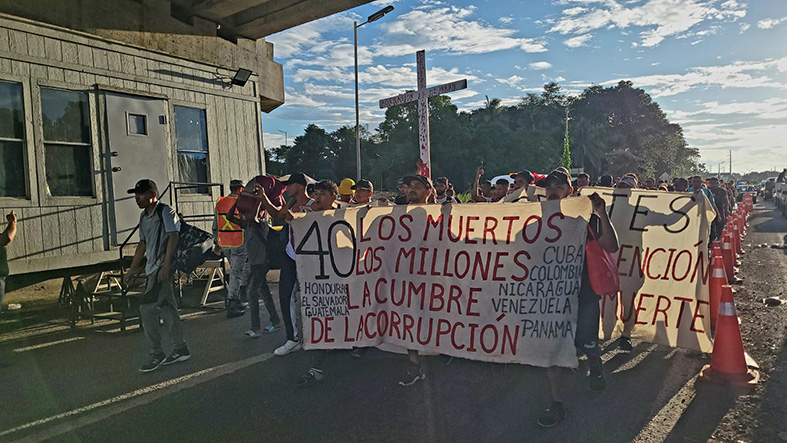Los miembros de la caravana salieron el pasado 30 de octubre de Tapachula caminaron 50 kilómetros en tres días y llegaron el pasado miércoles, donde se han instalado debajo de un domo, ahí se han cosido los labios, quemado piñatas con imagen de Francisco Garduño Yañez y ahora esperan un nuevo contingente de migrantes.