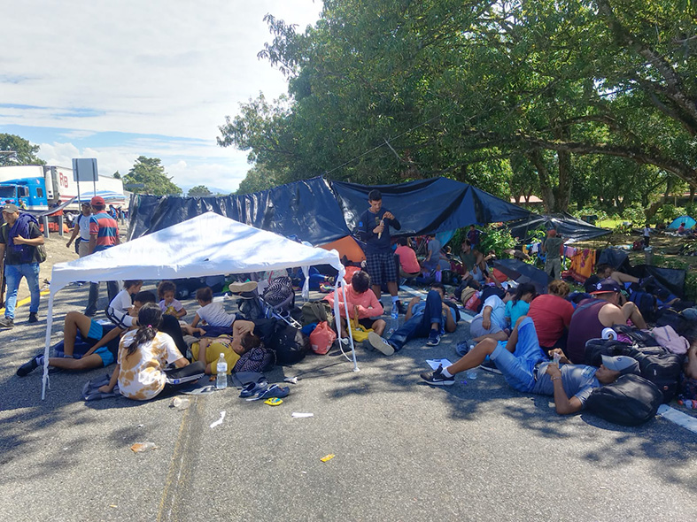 La caravana de personas en movilidad, detuvo su avance y bloqueó los cuatro carriles de la carretera federal 200 a la altura del centro aduanal de Huixtla, para solicitar documentos de viaje.