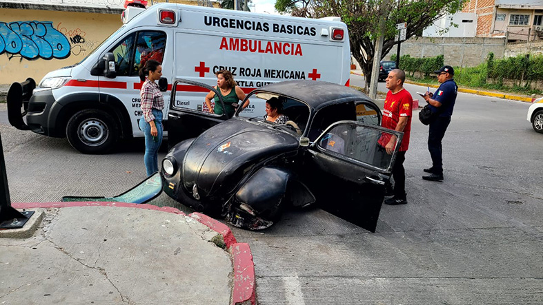 La mujer fue atendida y valorada en el lugar por el personal de la Cruz Roja pero no fue trasladada, mientras que el escarabajo fue llevado a un corralón en turno hasta que la autoridad determine su situación legal.