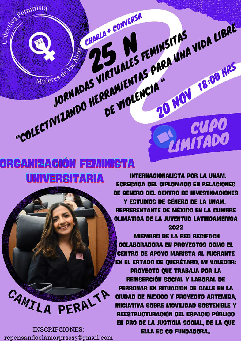 A pesar de que se cuenta con una Ley General Libre de Violencia para la Mujer, las estadísticas indican que al día asesinan a dos mujeres, por lo que es necesario seguir impulsado políticas públicas orientadas a erradicar este problema social, señaló Nadia López Velasco, coordinadora de la Colectiva Feminista Mujeres de Los Altos. En entrevista, anunció que en el marco del Día Internacional de la Eliminación de la Violencia contra la Mujer, la Colectiva Feminista Mujeres de Los Altos realizará una serie de jornadas feministas virtuales, «somos una Colectiva fundada hace 6 años y estamos haciendo activismo político feminista y nos parece importante tener encuentros como este para retroalimentarnos entre feministas, para hacer un colectivo y más mujeres puedan acceder a información y a una serie de herramientas para que la eliminación de la violencia a la mujer sea palpable». «Van a participar 5 ponentes, del 15 al 23 de noviembre, estará Samantha Peña con una plática enfocada a los derechos sexuales de las mujeres, el 16 estaré compartiendo un tema yo que habla sobre la politización de nuestras vivencias privadas, luego estará la compañera Andrea Gómez que es una gran activista, el día 20 estará Camila Peralta, ella nos va compartir el tema de organización Feminista dentro de las universidades, luego estará Gloria González que hablará sobre el tejido colectivo, y para finalizar Lupita Coutiño, el objetivo es ir haciendo un abanico de herramientas que nos ayude a erradicar la violencia hacia la mujer”, agregó.