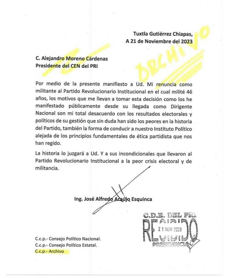 Alfredo Araújo Esquinca, presentó el día de ayer su renuncia como militante del Partido Revolucionario Institucional (PRI), tras más de 46 años de militancia en ese partido. Señaló que el motivo de su salida del PRI es porque está en completo desacuerdo con la manera en que Alejandro “Alito” Moreno Cárdenas conduce al Revolucionario Institucional desde su llegada a la dirigencia nacional de ese organismo político. “Los motivos que me llevan a tomar esta decisión como los he manifestado públicamente desde su llegada como Dirigente Nacional son mi total desacuerdo con los resultados electorales y políticos de su gestión que sin duda han sido los peores en la historia del Partido”, expuso en su documento de renuncia el ahora ex priista.